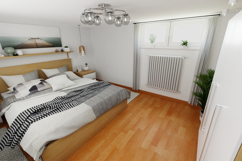 Im Erdgeschoss befinden zwei Zimmer, eine Küche, Diele, Gäste- WC und Abstellraum sowie der Zugang zum eigenen Garten.